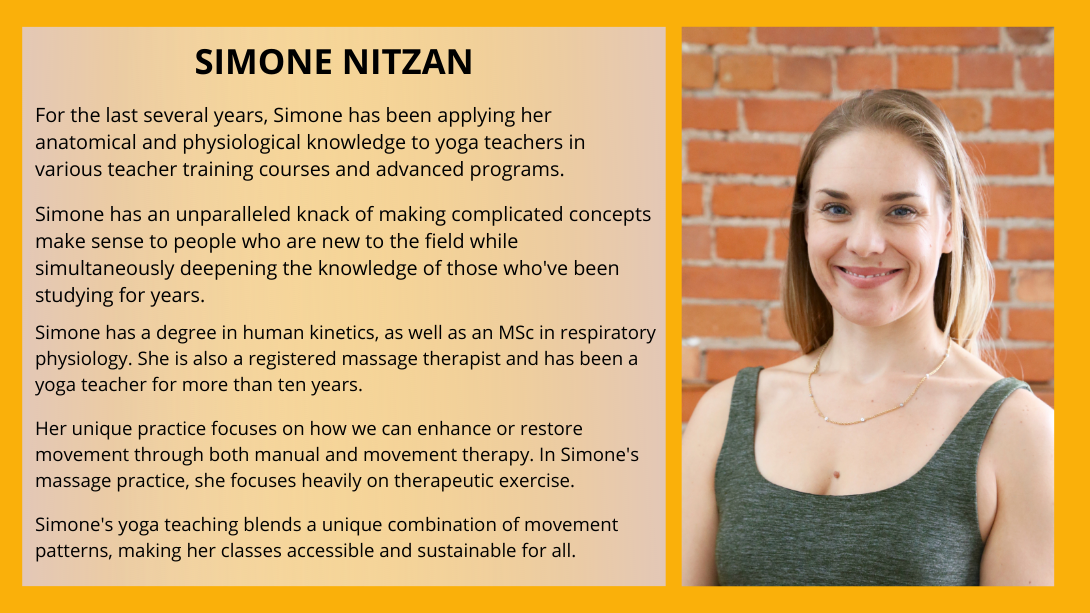Hosted by Simone Nitzan, respiratory physiologist, Registered Massage Therapist & yoga teacher